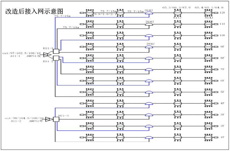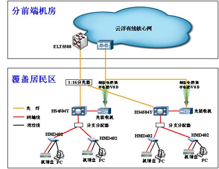 廣東省云浮市電視臺(tái)NGB網(wǎng)絡(luò)采取星型架構(gòu),BOSS系統(tǒng)負(fù)責(zé)用戶的接入認(rèn)證和業(yè)務(wù)下發(fā),ELT5500進(jìn)行業(yè)務(wù)覆蓋和匯聚,接入網(wǎng)采用PON+EoC的組網(wǎng)方式。機(jī)頂盒采用多模機(jī)頂盒,即數(shù)字電視以QAM形式通過同軸電纜下發(fā),VOD業(yè)務(wù)以IPQAM的形式通過同軸電纜下發(fā),認(rèn)證、OVD信令、上網(wǎng)等業(yè)務(wù)采用IP傳輸方式,以PON+EoC的方式傳輸。截止2012年底,我司設(shè)備已在云浮覆蓋超過10萬用戶。